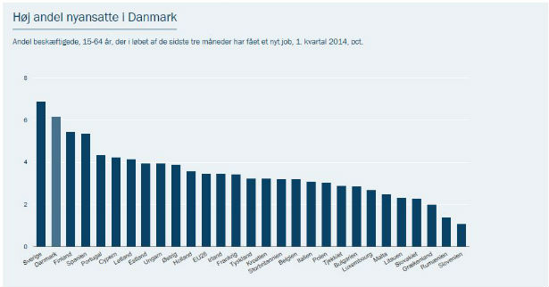 Sammenlignet med andre EU-lande ligger Danmark nr. 2 efter Sverige, når man ser på hvor stor andel af de beskæftigede, der er nyansatte i 1. kvartal 2014. Den samlede andel nyansatte i europæisk sammenligning består både af personer, der kommer fra beskæftigelse, ledighed og andet.