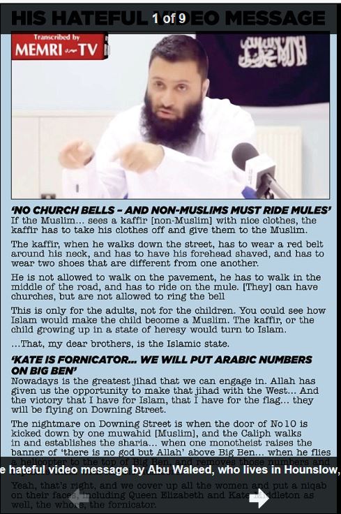 Han fabler således om, at også Dronning Elizabeth og “horen Kate Middleton” skal tvinges til at gå med niqab i en islamisk stat. Han forsikrer, at premierminister David Cameron vil komme kravlende på hænder og knæ for at betale jiziyia, særskatten for de vantro.