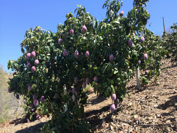 Farven snyder lidt, de er mere røde end lilla. Måske kommer du til at spise en af dem på træet. Vi er medlem at et stort kooperativ firma der hedder TROPS og som eksporterer avokado- og mangofrugter til hele Europa. Vi høster kun om efteråret, så resten af året er mangofrugterne i de danske supermarkeder sandsynligvis fra Sydamerika.