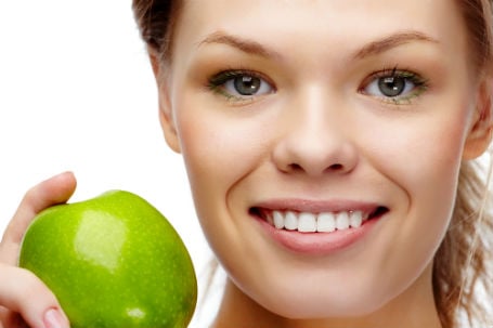 Du kan også spise et æble, hvis du gerne vil have pænere tænder. For teksturen og fibrene i æblet skrubber faktisk dine tænder, mens du spiser det. Og på den måde kan man reducere synlige misfarvninger på tænderne. Æblesyre kan også til en vis udstrækning hjælpe med at opløse belægning på tænderne. (Dagens.dk)