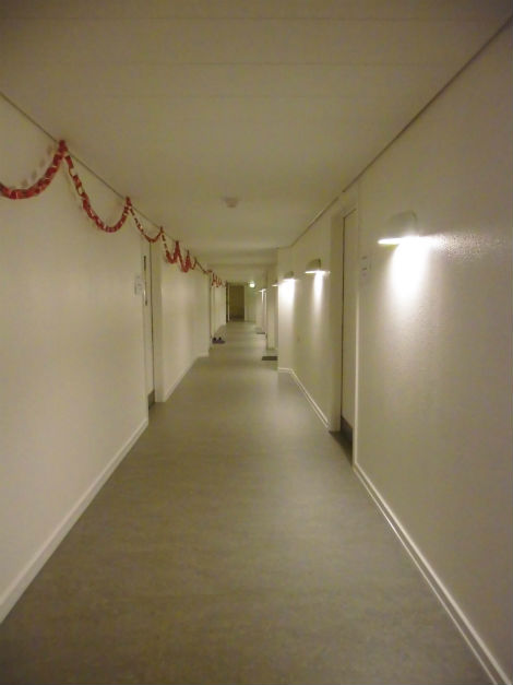 Der er et fælleskøkken på hver etage. De dekorative runde ting i vinduet er knækbrød.