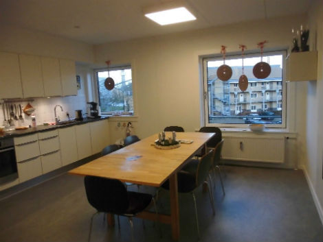 Fælleskøkkenet bærer præg af de sociale viceværters tilstedeværelse, der er rydeligt og rent, og med fine påmindelser om julens komme. Det er de unge selv, der gør rent i fælleslokalerne, men viceværterne lader forstå, at man har en løbende dialog om emnet.