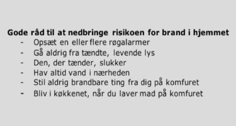 - De fleste brande kan forebygges gennem viden og rigtig adfærd. Røgalarmer er effektive i forhold til at begrænse en brand og redde liv.