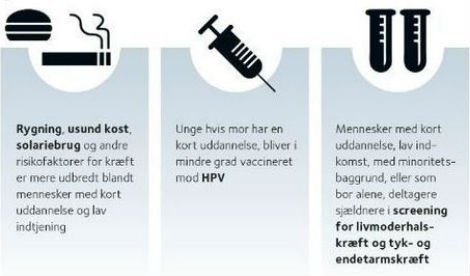 Uligheden begynder allerede ved de livsstilsfaktorer, som har betydning for, om man får kræft. Der er flere kortuddannede, lavtlønnede og enlige, der ryger og spiser usundt, hvilket er de største livsstils- og miljømæssige årsager til kræft. Der er også flere overvægtige og fysisk inaktive i disse grupper og mindre sandsynlighed for, at både døtre og sønner kommer til lægen og får HPVvaccinen.
