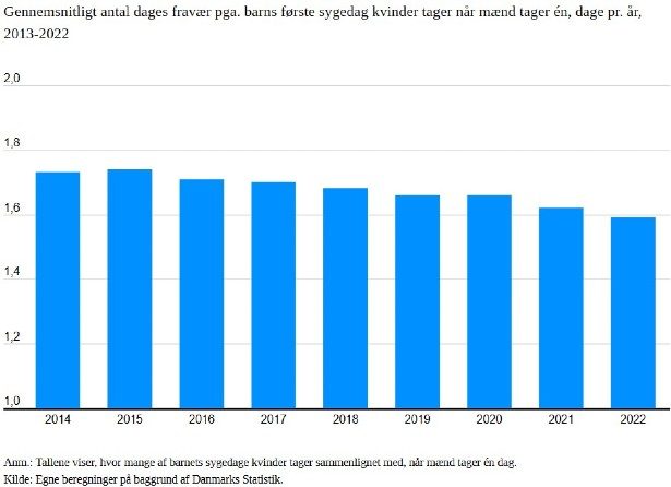 I 2013 var det sådan, at hver gang far tog én af barnets sygedage, så havde mor ved udgangen af året taget 1,84 gang flere. I 2022 er tallet faldet til 1,59 gang flere, hvilket svarer til et fald på ¼ dag.