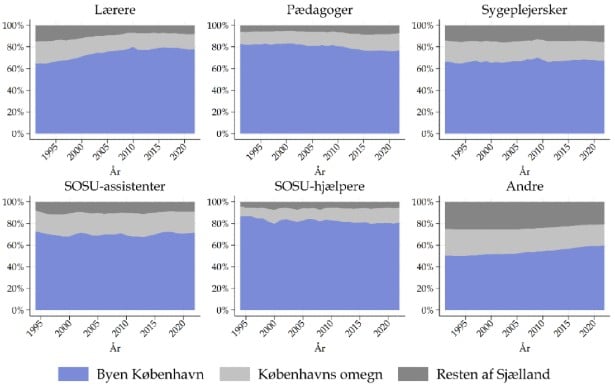 Og man kunne tilføje ”stadig”: De seneste 10-15 år er der nemlig ikke sket markante fald i andelen af velfærdsmedarbejdere med bopæl i København.