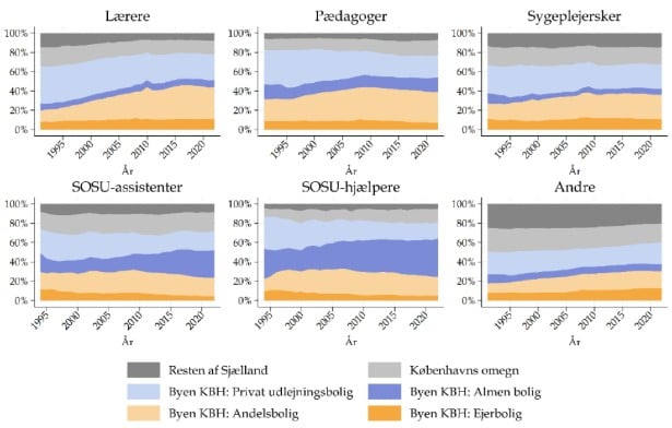 Figurnote: Figuren viser andelene af hver faggruppe og resten af arbejdsmarkedet med arbejdsplads i Byen København som bor i Byen København, og herunder i hvilke boligtyper, i Københavns omegn og på resten af Sjælland over tid. Kilde: Egne beregninger på data fra Danmarks Statistik