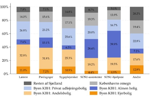 Figurnote: De enkelte faggruppe blandt velfærdsmedarbejdere og andre lønmodtagere, der arbejder på en adresse i København, er her delt op efter hvilke boligtyper, de bor i i byområdet København i 2022. Medarbejdere, der bor i Københavns omegn og på resten af Sjælland, er ikke inddelt på boligtype. Kilde: Egne beregninger på data fra Danmarks Statistik