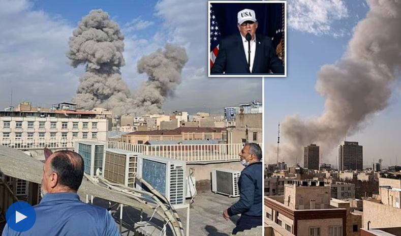 Billeder viser røg, der stiger op i Teheran , efter at der er blevet hørt eksplosioner i fem byer i Iran. Især er Hovedstaden Teheran blevet ramt.